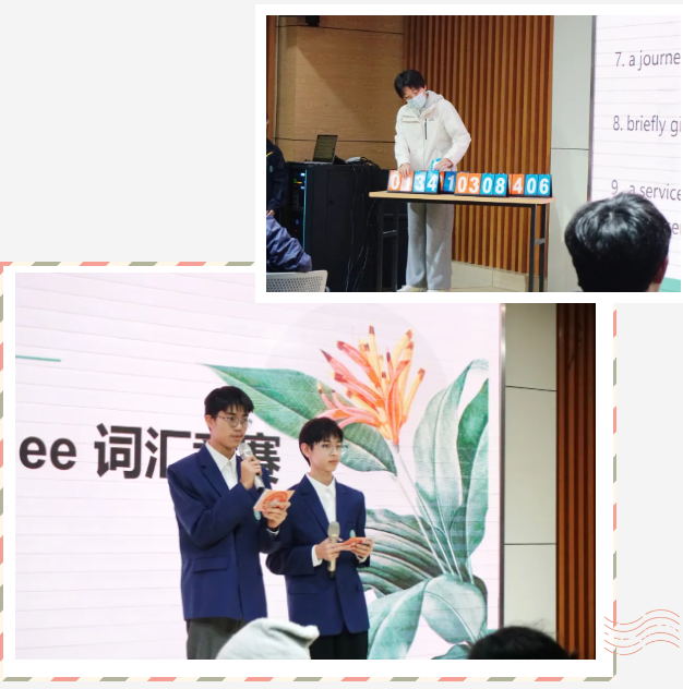 第三部分是单项选择环节。选手们需要在四个选项中选出最符合题干描述的单词。随着主持人的指令,每组成员都迫不及待地站起来抢答,希望为自己的小组增光添彩。同学们的表现令人瞩目,展现了他们扎实的英语功底和敏捷的思维。