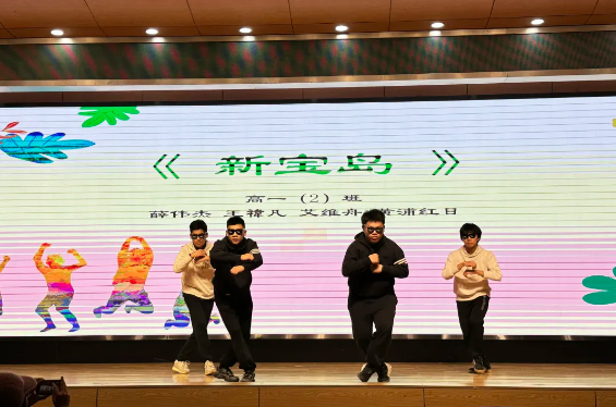 极具魔性的旋律响起,是高一(2)班登场了,他们用热情演绎无限欢乐的《新宝岛》,将这股潮流旋风搬上了舞台,点燃全场。欢呼声与快乐装满了整个礼堂。