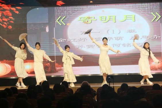 一袭白裙,一把折扇,高一(1)班表演的《寄明月》让我们感受到了古风舞曲的婉约柔美,灵动曼妙,为比赛注入了独特的国潮色彩。