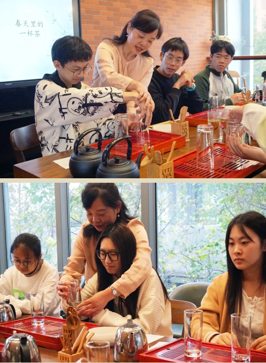 随着老师们的悉心教导,同学们也渐渐地熟练了倒茶端茶时诸如“茶口不能对人”、“手指要顶住茶盖”之类的姿势要点。茶路过半,同学们缓缓起身,定神倒水,那“凤凰三点头”的冲泡动作,也只是为了能够让自己的茶变得更加入味,更加入神。